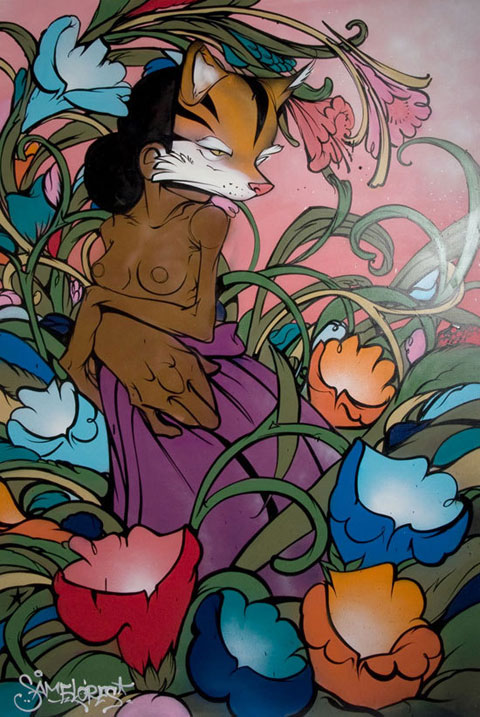 Sam Flores has always been one of my favorite artists because he incorporates 2 of my great loves cartoons and graffiti in his work. His style reminds me of some of the characters drawn by a talented graphic designer, whom I once work with in the salt mines of corporate america(shout out to Brad). Below is his modest bio lifted from Wikipedia and a short interview with vimby TV. Get familiar.